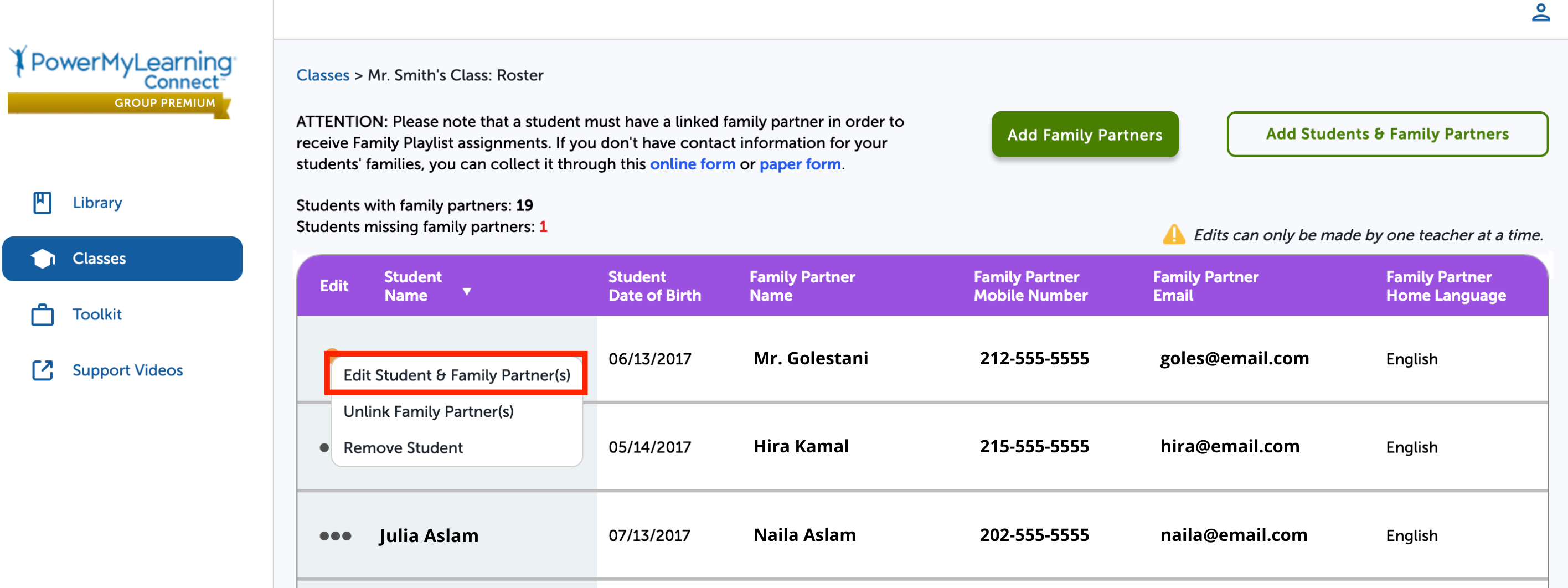 Teachers can update student or family partner information in the class roster. This includes details such as names, contact information, and home language.